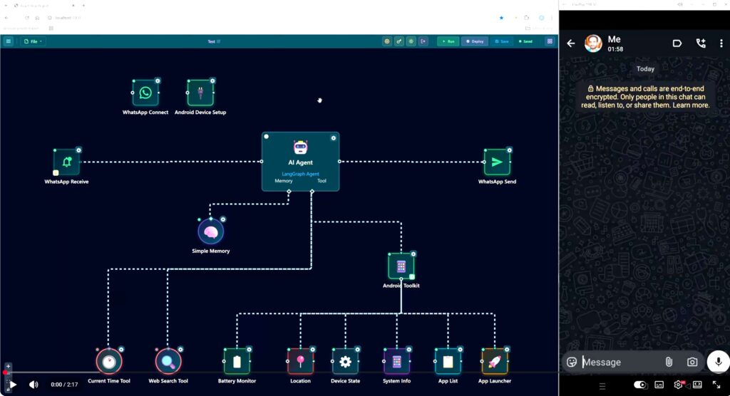 MachinaOS cherche également à se distinguer par ses connexions avec le monde réel. La plateforme promet d’automatiser Google Workspace — email, calendrier, Drive, feuilles de calcul, tâches, contacts —, d’envoyer des messages via WhatsApp, Telegram et X, ainsi que de contrôler un appareil Android (WiFi, Bluetooth, caméra, applications, état du dispositif). La documentation publique confirme certaines de ces fonctionnalités, notamment pour WhatsApp, Android, les webhooks, HTTP, et l’exécution de code Python dans les workflows.