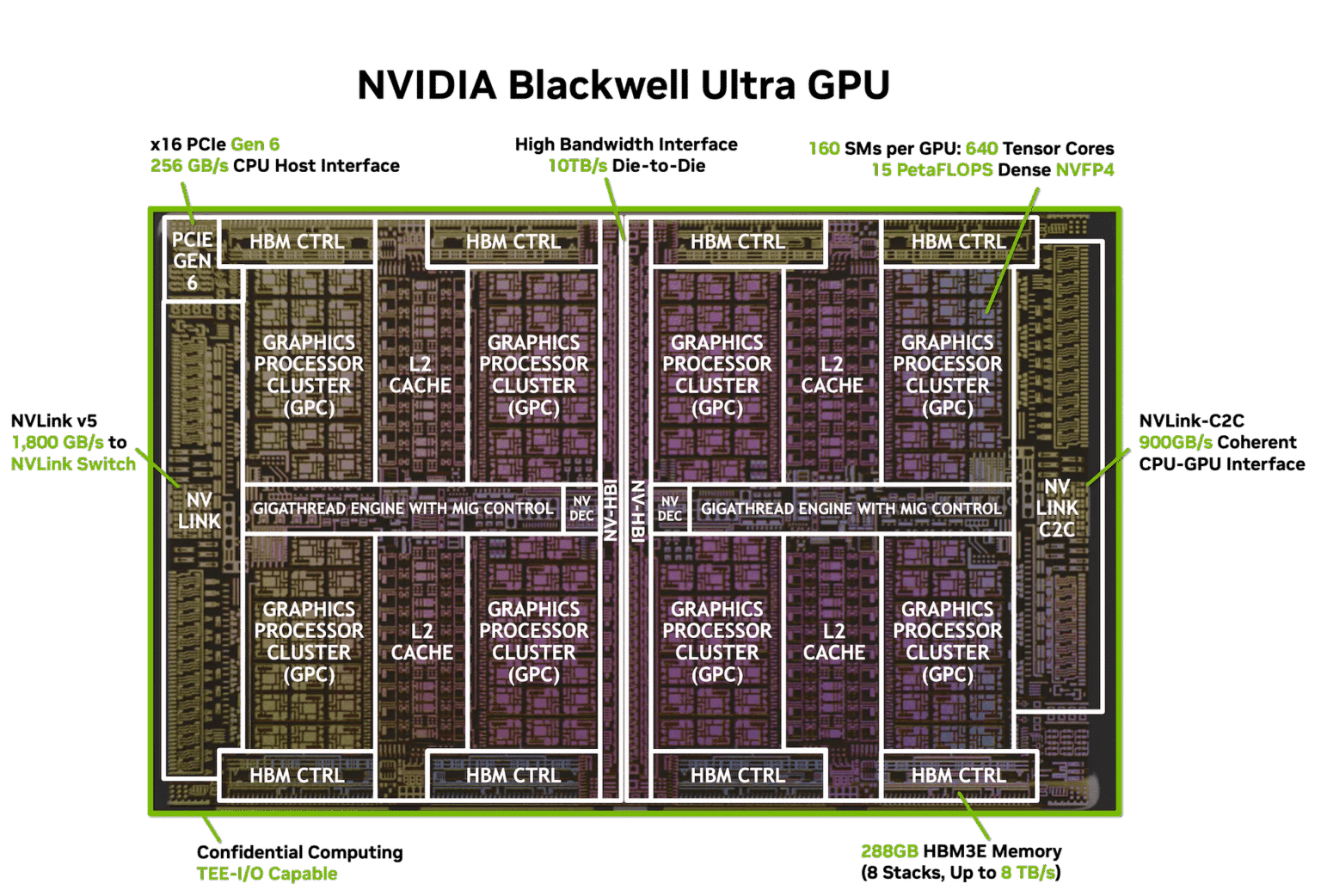 Au cœur de chaque GPU, 160 multiprocesseurs de flux (SM) sont organisés en huit clusters. Chaque SM comprend 128 cœurs CUDA, quatre Tensor Cores de cinquième génération utilisant la seconde version du Transformer Engine, optimisés pour des formats à faible précision comme FP8, FP6 et le nouveau NVFP4, ainsi que 256 Ko de mémoire Tensor conçus pour réduire le trafic vers la mémoire externe. La nouvelle norme NVFP4 utilise un équilibrage entre efficacité et précision, permettant une consommation mémoire jusqu’à 3,5 fois inférieure et une puissance dense atteignant 15 PetaFLOPS.