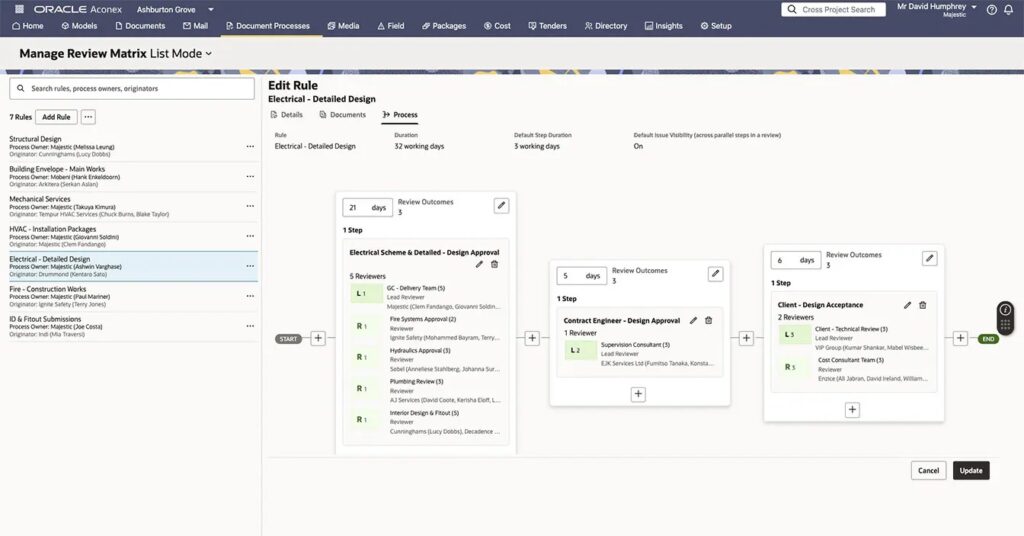 En complément, une Review Matrix automatisée initie le flux d’approbation adéquat en fonction des métadonnées de chaque document. Concrètement, cela signifie que les livrables peuvent être distribués selon une séquence prédéfinie et selon des règles configurées pour chaque projet, évitant ainsi une improvisation fréquente lorsque plusieurs entrepreneurs, ingénieries et propriétaires interviennent sur la même documentation. La documentation d’Aconex précise que cette matrice de revue définit quels documents doivent être examinés, par qui, et selon quel processus, en utilisant précisément ces métadonnées.