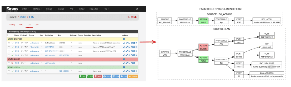 L’approche visuelle permet de visualiser rapidement sources, destinations, ports et actions (PASS/BLOCK), tout en mettant en évidence les règles désactivées, ce qui accélère la revue technique et les audits.