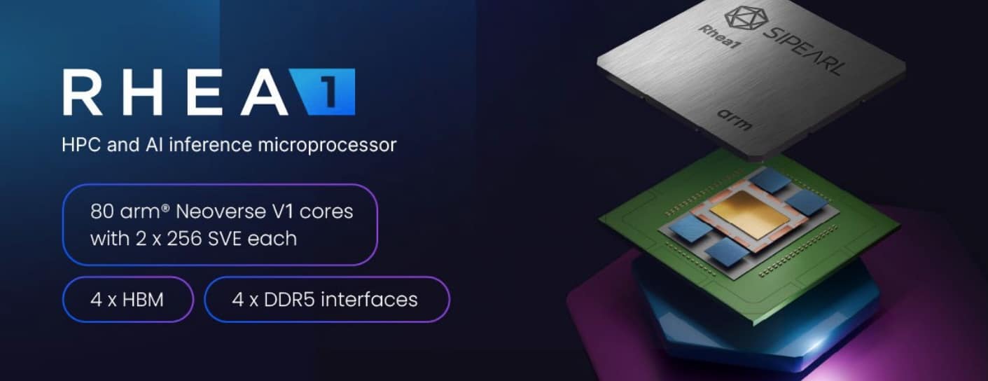 Basé sur la plateforme Arm® Neoverse V1, Rhea1 intègre 80 cœurs hautes performances, chacun doté de deux unités SVE (Scalable Vector Extension) de 256 bits, rendant le processeur particulièrement adapté aux opérations vectorielles intensives, comme celles utilisées dans les simulations scientifiques ou les applications d’IA.